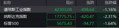 美股三大指数集体低开,道指跌1.01%,纳指跌1.97%,标普500指数跌1.34%。大型科技股普跌,特斯拉跌近4%,英伟达、谷歌跌超2%,苹果、微软跌超1%。