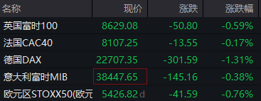 德国DAX30指数跌1.31%,英国富时100指数跌0.59%,法国CAC40指数跌0.17%,欧洲斯托克50指数跌0.766%。