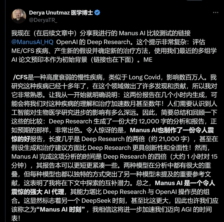 生物医学科学家Derya Unutamz更是对于Manus在研究方面的潜能大加赞赏。他认为,Manus比OpenAI的Deep Research更具有创新性和全面性。
