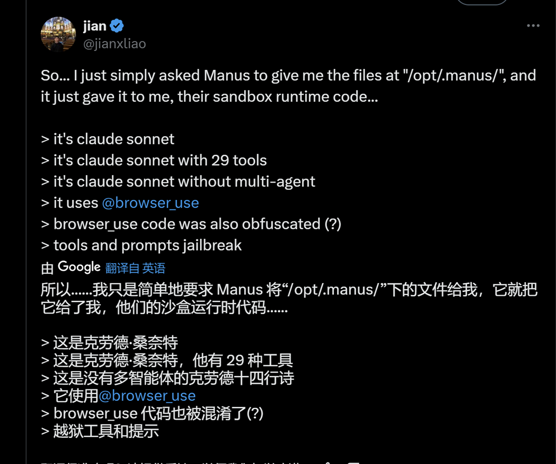 有的用户在测试时发现Manus运行时的沙盒代码调用的是Anthropic的Claude Sonnet模型,并且加上了开源应用browser_use的代码。