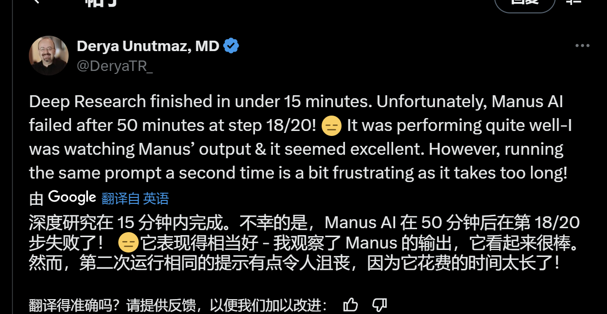 上文所提到的生物学家Derya Unutamz使用Manus帮助生成研究报告,在接近完成报告的时候发生了错误,在他第二次尝试生成报告时也出现服务器错误,导致失败。而OpenAI的Deep Research只花费了极短的时间就完成了报告。