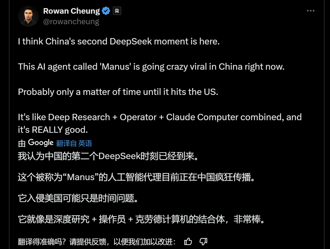 在X平台上,首先是科技作家Rowan Cheung讨论起了Manus。他认为中国的“第二个DeepSeek时刻”来了。