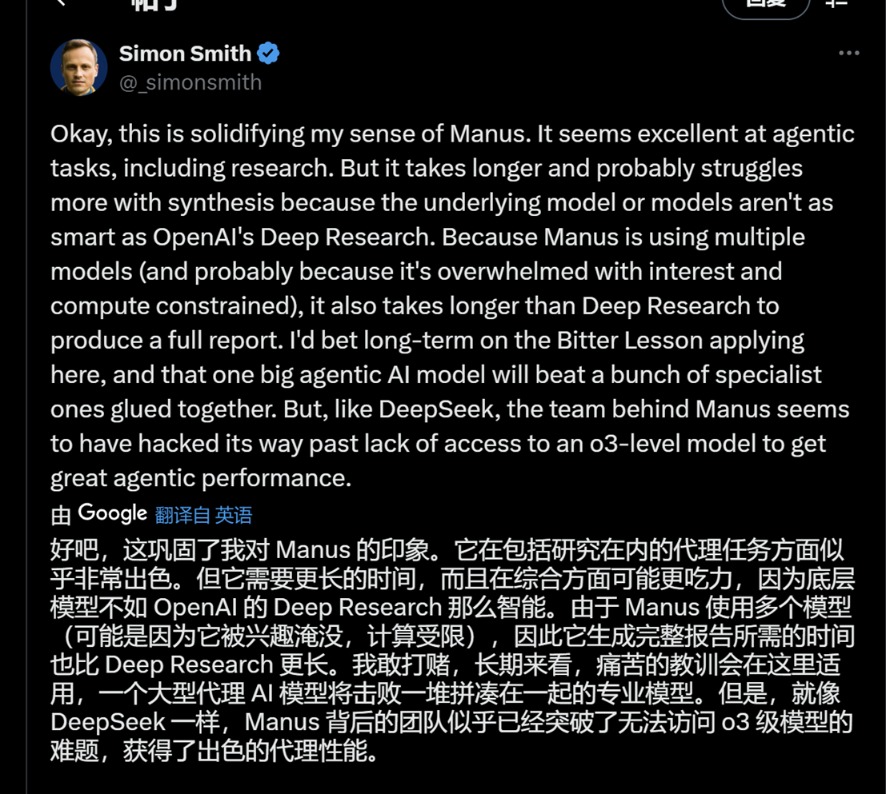 周末,X平台上关于Manus的讨论逐渐多了起来。推特联合创始人杰克·多尔西称赞Manus为杰出的工作;Hugging Face的产品负责人Victor Mustar在体验后认为,Manus是他体验过的最好的AI工具;甚至有人喊出了“第二个DeepSeek时刻”。