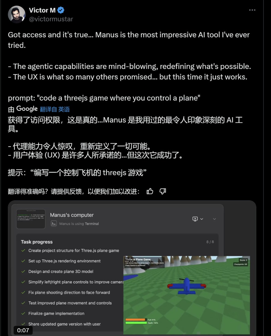 Hugging Face的产品负责人Victor Mustar使用Manus编写了一个飞机小游戏,并称其为他体验过的最令人印象深刻的AI工具。之后,他还在评论区补充说道:“Manus会杀死Vibe Coding。”(Vibe Coding是由OpenAI联合创始人Anderj Karpathy提出的概念,即只需要提出需求就能让电脑自行生成代码。)