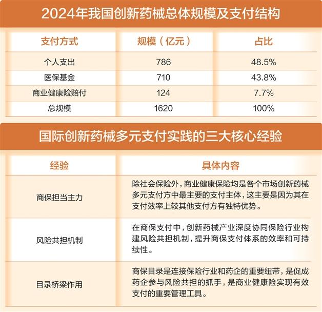 不过,从创新药械付费方来看,个人、医保仍是主力,商保贡献较低。据中再寿险、镁信健康、波士顿咨询联合编写的《中国创新药械多元支付白皮书(2025)》估算,2024年我国创新药械市场规模达1620亿元。其中,医保基金支付约710亿元,占比近44%;个人现金支付约786亿元,占比近49%;商业健康保险支出约124亿元,占比7.7%。