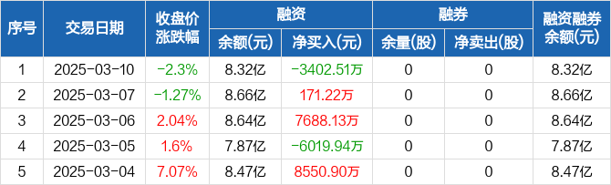 融资方面,当日融资买入1.49亿元,融资偿还1.83亿元,融资净偿还3402.51万元。融券方面,融券卖出0股,融券偿还0股,融券余量0股,融券余额0元。融资融券余额合计8.32亿元。