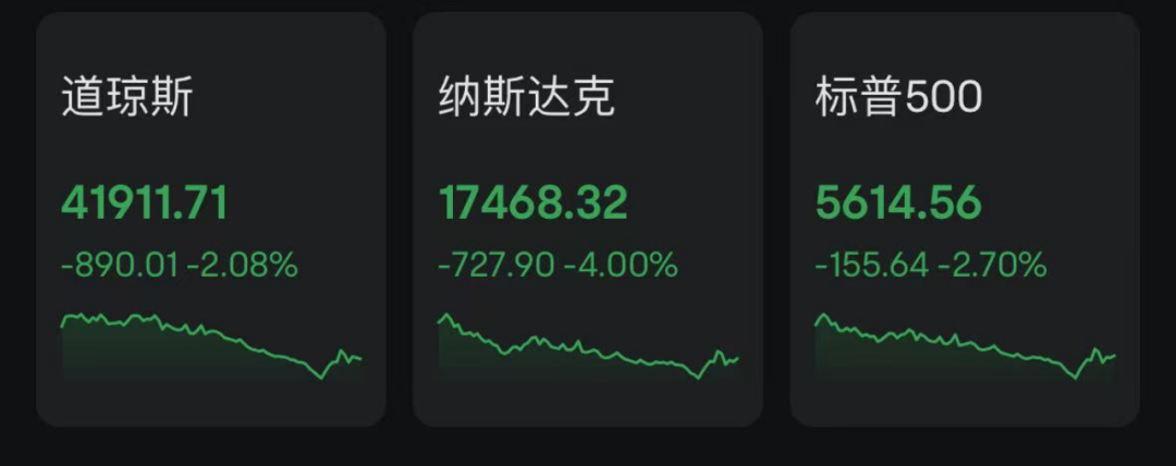 美股经历惊魂一夜!当地时间周一,美股三大股指全线重挫,道指跌超890点,跌幅2.08%;标普500指数跌155.64点,跌幅2.7%;纳指跌近728点,大跌4%,创2022年9月以来最大单日跌幅。
