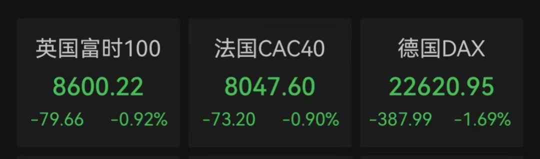 欧洲三大股指全线下跌,德国DAX指数跌1.69%报22620.95点,法国CAC40指数跌0.9%报8047.60点,英国富时100指数跌0.92%报8600.22点。