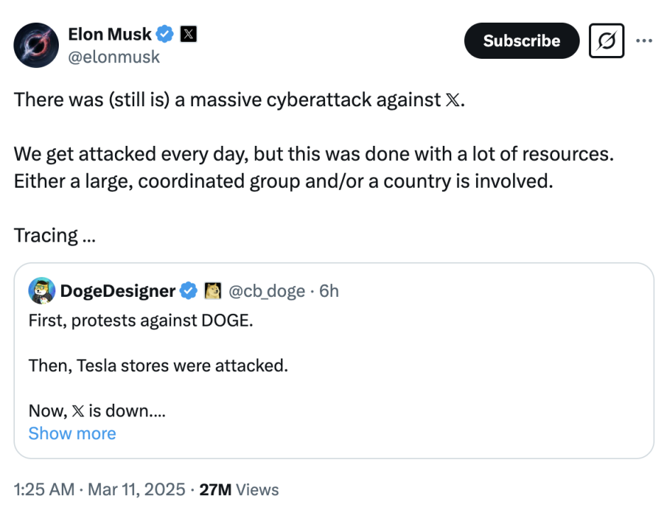 马斯克回应当日X出现故障的问题称,这是针对X的大规模网络攻击。他表示:“我们每天都会遭受攻击,但这次攻击耗费了大量资源。要么是一个大型的、有组织有计划的团体,要么是一个国家。”