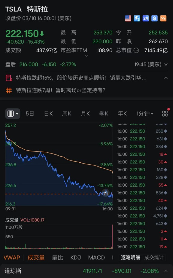 当地时间周一,特斯拉跌超15%,创下2020年9月以来最大单日跌幅,股价收于222.15美元/股,较去年12月中旬的高位直接“腰斩”,市值一夜蒸发超1303亿美元(约合人民币9460亿元)。