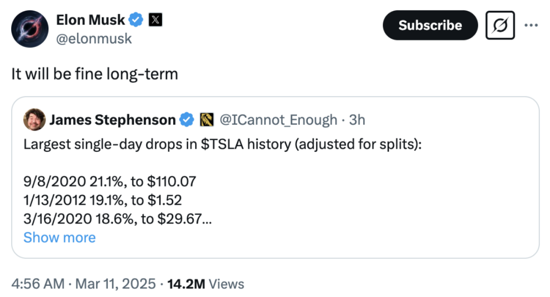 当日,马斯克在社交媒体平台X回复了关于特斯拉最大单日跌幅的帖子。他表示,从长期来看一切会好起来。