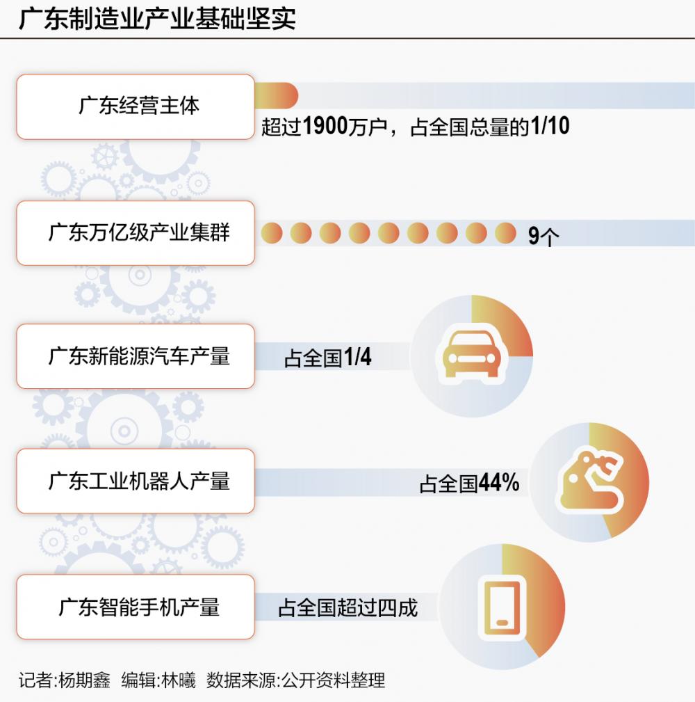 过去40多年来,这个中国经济第一大省以改革开放前沿的角色在中国经济发展征程中有着浓墨重彩戏份,又以经济转型先锋的姿态闯过每一个跌宕起伏的周期。这一征程中,广东积淀形成雄厚的制造基础、活跃的科技创新生态、完善的产业配套体系、优越的营商环境、发达的开放网络和庞大的消费市场,并最终垦造出一片充满机遇的沃土,孵化出研祥、小鹏、大疆、优必选、文远知行、小马智行乃至华为、腾讯、比亚迪、美的、TCL等诸多巨龙、大龙和小龙。截至2024年末,广东拥有超过1900万户经营主体,占全国总量的1/10;形成9个万亿级产业集群,新能源汽车产量占全国1/4、工业机器人产量占全国44%、智能手机产量占全国超过四成。