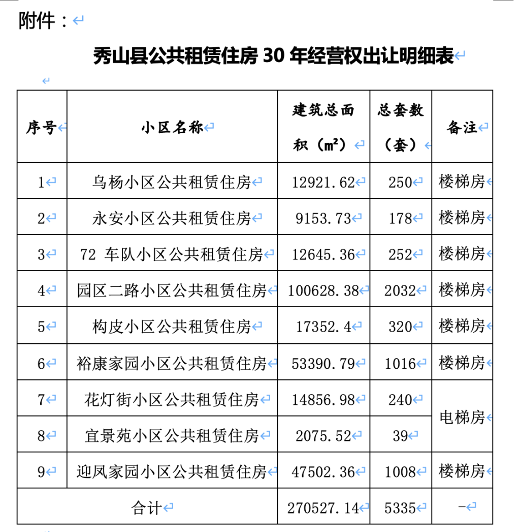 根据公告,秀山县公共租赁住房30年经营权转让底价3.76亿元,转让方为秀山土家族苗族自治县住房保障管理中心。标的包含乌杨小区、永安小区等9处公共租赁住房经营权,建筑总面积27.052714万平方米,总套数5335套。