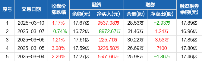 融资方面,当日融资买入3.21亿元,融资偿还2.26亿元,融资净买入9537.08万元。融券方面,融券卖出1.01万股,融券偿还3.94万股,融券余量28.53万股,融券余额2213.54万元。融资融券余额合计17.89亿元。