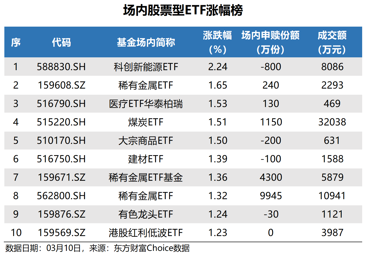 数据显示,昨日场内股票型ETF中,科创新能源ETF、稀有金属ETF、医疗ETF华泰柏瑞涨幅居前。其中,科创新能源ETF涨幅最大,为2.24%。