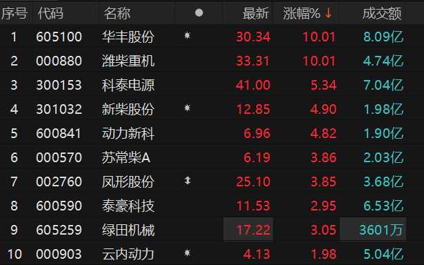 上证报中国证券网讯 3月11日,发电机概念拉升,截至9时59分,潍柴重机4天2板,股价创历史新高,华丰股份13天10板,科泰电源、新柴股份、泰豪科技等跟涨。