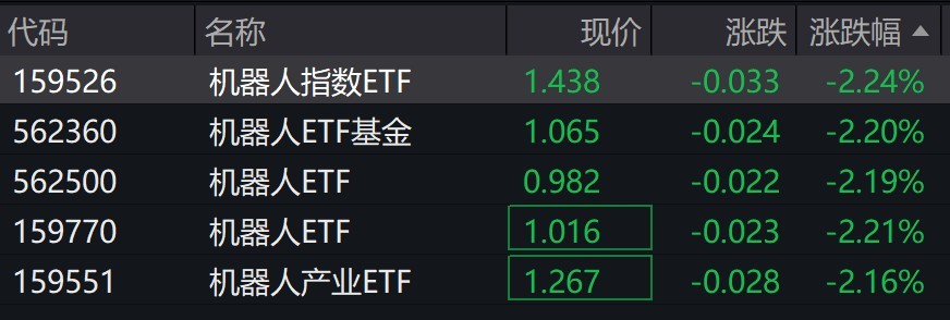受重仓股调整影响,跟踪中证机器人指数的ETF跌逾2%。