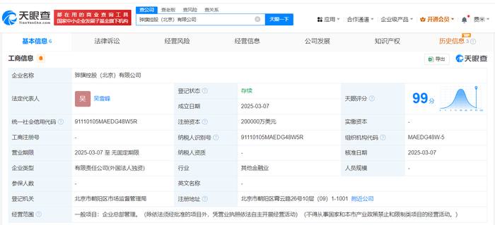 天眼查App显示,近日,骅旗控股(北京)有限公司成立,法定代表人为吴雪峰,注册资本20亿美元,经营范围为企业总部管理。股东信息显示,该公司由花旗金融控股集团全资持股。