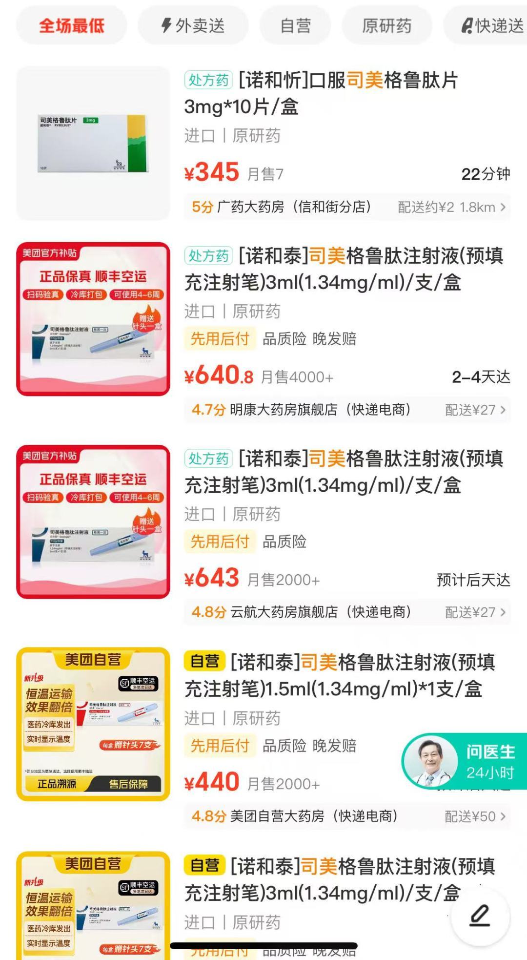 或是因为开年了大家更注重健康,部分人群想告别过年期间增加的体重,平台上减重产品的搜索量同比翻倍。截至昨日,美团自营大药房数据显示,司美格鲁肽搜索周环比增长近180%,替尔泊肽搜索日环比增长150%。自今年入春以来,美团上包括上述“马斯克同款”(GLP-1)在内的减重产品搜索量同比翻倍。