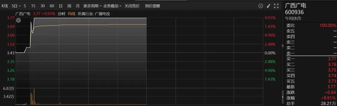 广电概念股早间低开高走,板块指数盘初快速拉升一度涨逾2%。湖北广电一字涨停,连续第4日涨停,创近2年新高,广西广电亦垂直拉升,仅用约3分钟就封死涨停,歌华有线、江苏有线等也逆势上扬。