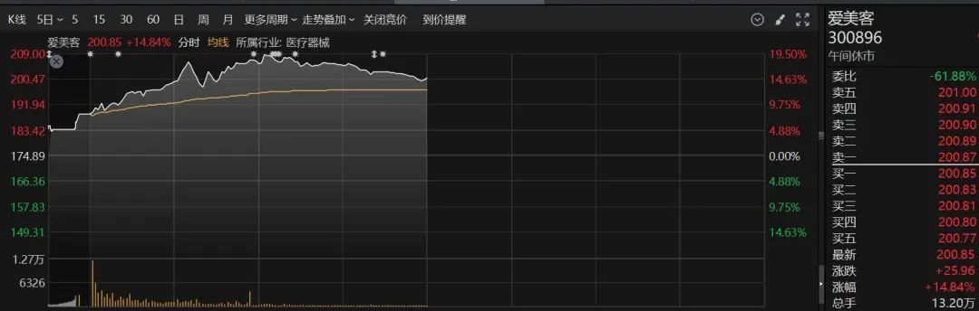 医疗美容概念早间逆势大幅高开高走,板块指数一度放量飙升逾11%,创年内新高,开盘仅10分钟成交就超过昨日全天成交,半日成交较昨日全天成交激增逾200%。爱美客盘中冲击20%涨停,华熙生物、锦波生物等涨幅居前。