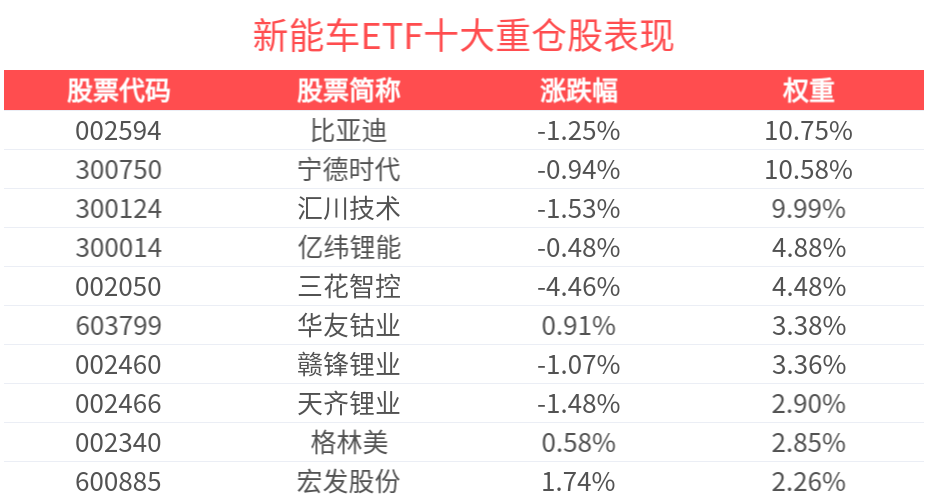 数据显示,截至2025年2月28日,中证新能源汽车产业指数(930997)前十大权重股分别为比亚迪(002594)、汇川技术(300124)、宁德时代(300750)、三花智控(002050)、亿纬锂能(300014)、华友钴业(603799)、赣锋锂业(002460)、格林美(002340)、天齐锂业(002466)、天赐材料(002709),前十大权重股合计占比56.9%。