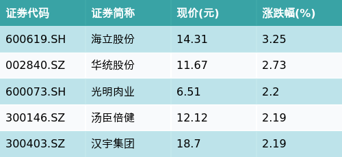 截至收盘,家电零部件主题涨跌幅最高的五只股票为:海立股份(600619.SH)、华统股份(002840.SZ)、光明肉业(600073.SH)、汤臣倍健(300146.SZ)与汉宇集团(300403.SZ)。详情见下表: