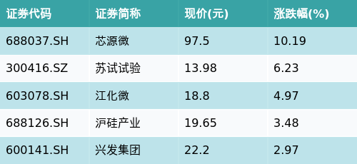 截至收盘,中芯国际概念主题涨跌幅最高的五只股票为:芯源微(688037.SH)、苏试试验(300416.SZ)、江化微(603078.SH)、沪硅产业(688126.SH)与兴发集团(600141.SH)。详情见下表: