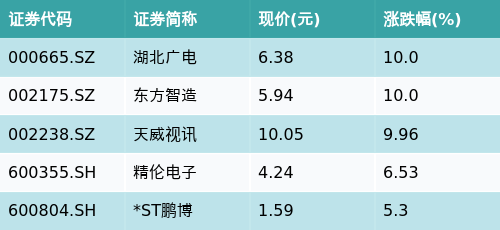 截至收盘,智能电视主题涨跌幅最高的五只股票为:湖北广电(000665.SZ)、东方智造(002175.SZ)、天威视讯(002238.SZ)、精伦电子(600355.SH)与*ST鹏博(600804.SH)。详情见下表: