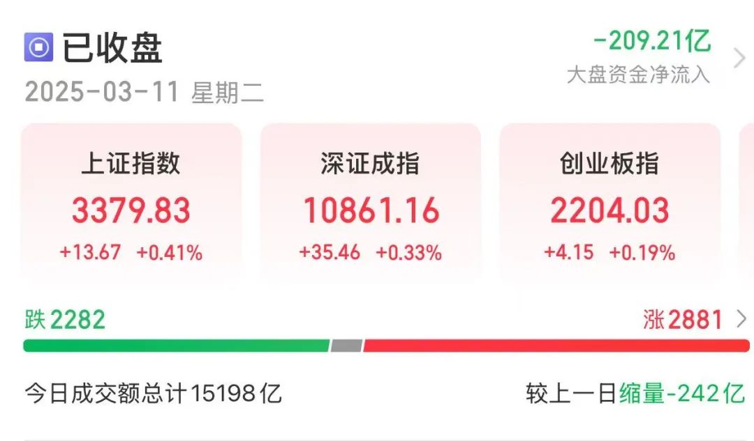 今日,A股低开高走。截至收盘,沪指涨0.41%,深证成指涨0.33%,创业板指涨0.19%,A股市场合计成交15198亿元,较昨日缩量242亿元。