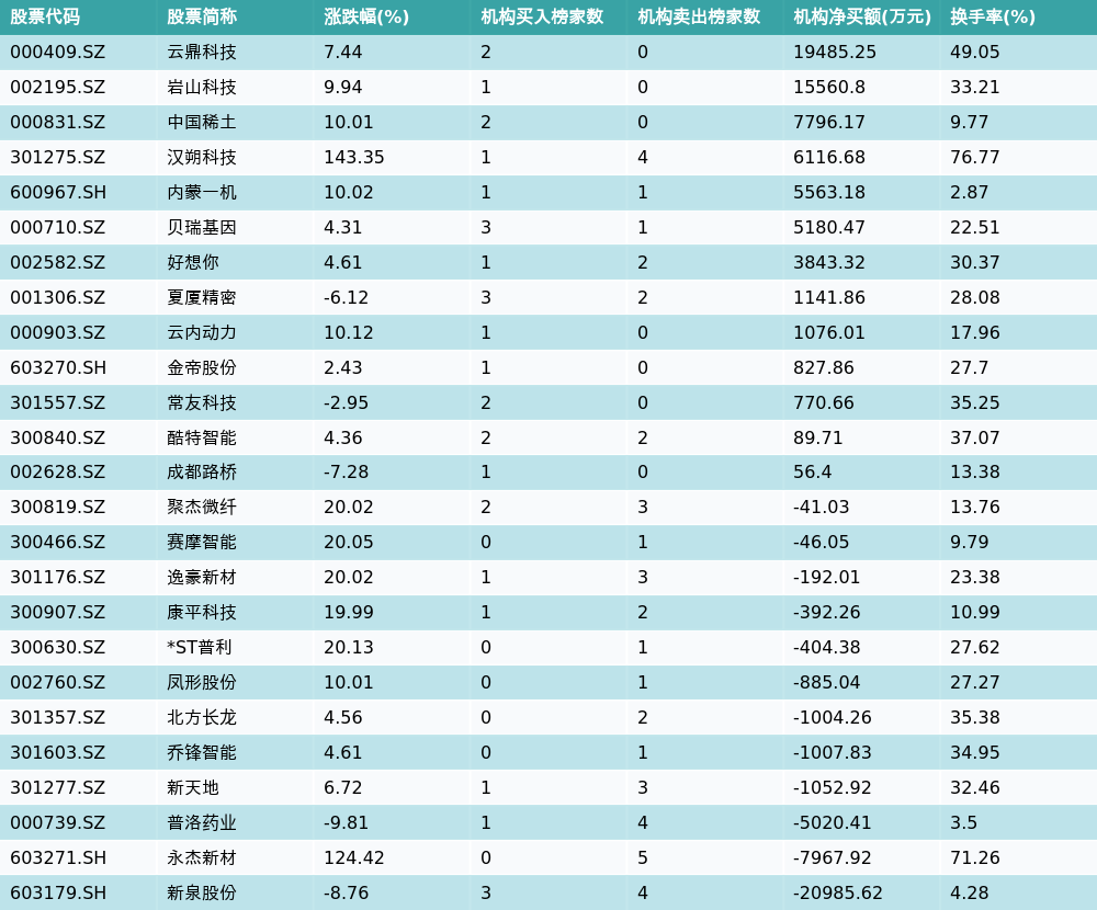 南方财经3月11日电,南财金融终端数据显示,因当日异动登上龙虎榜的个股中,25只沪深A股龙虎榜出现了机构的身影,机构合计净买入28508.64万元,具体来看,机构净买入13只个股,净卖出12只个股。其中,机构净买入前三分别为云鼎科技(000409.SZ)、岩山科技(002195.SZ)与中国稀土(000831.SZ),详情见下图:
