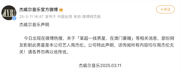 3月11日,@杰威尔音乐官方微博发布声明:今日出现在微博热搜,关于「某超一线男星,在澳门豪赌」等相关消息,部份网友影射此男星是本公司艺人周杰伦。公司特此声明,该传闻所有内容均与周杰伦无关!请各界勿再以讹传讹。
