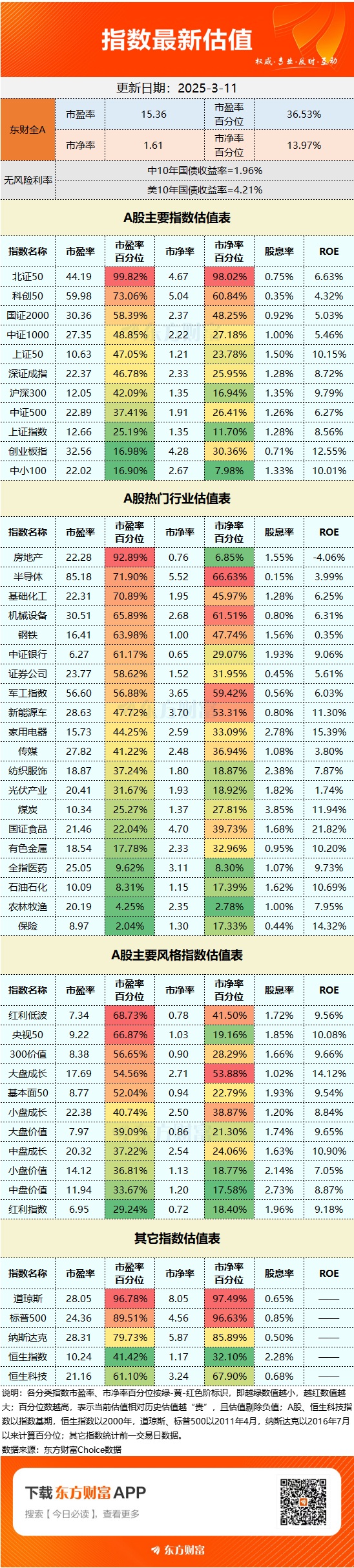 截至3月11日收盘,东方财富Choice数据显示,东财全A市盈率为15.36倍,市盈率百分位为36.53%;市净率为1.61倍,市净率百分位13.97%。