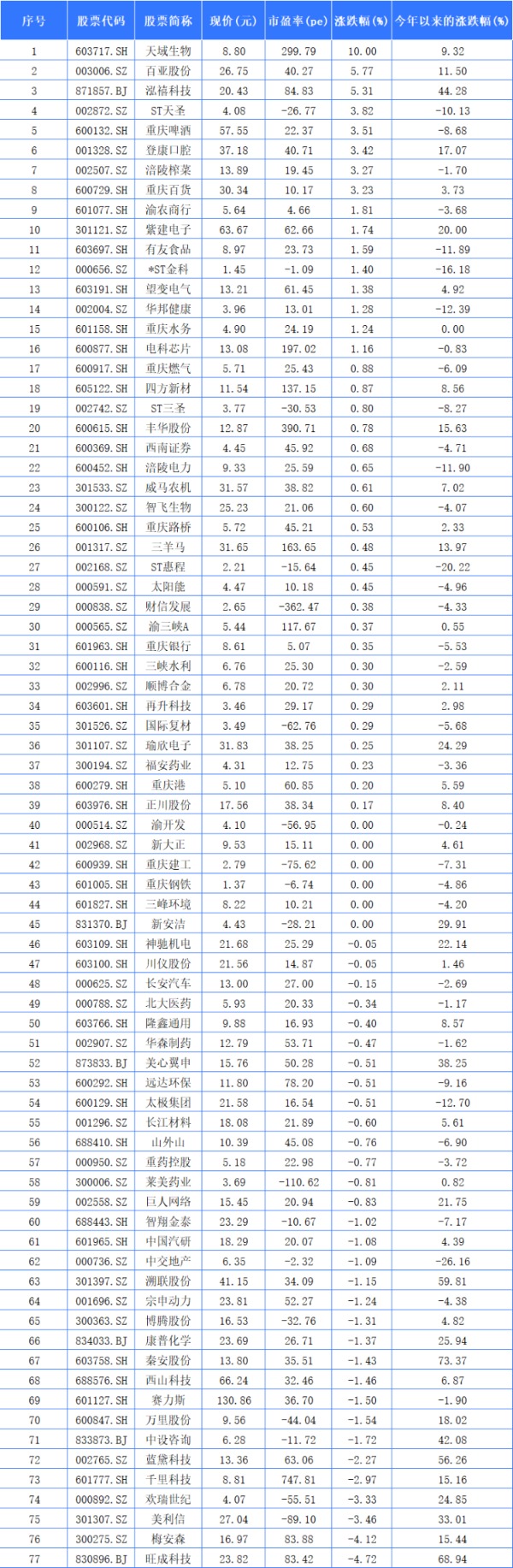 2025年3月11日,除新铝时代停牌之外,77家重庆A股上市公司中有39家上涨。