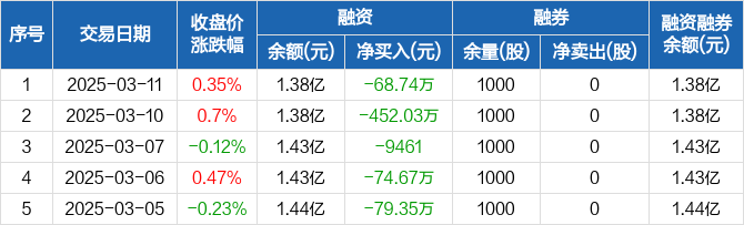 融资方面,当日融资买入417.11万元,融资偿还485.85万元,融资净偿还68.74万元,连续6日净偿还累计677.71万元。融券方面,融券卖出0股,融券偿还0股,融券余量1000股,融券余额8700元。融资融券余额合计1.38亿元。