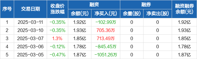 融资方面,当日融资买入1086.66万元,融资偿还1189.65万元,融资净偿还102.99万元。融券方面,融券卖出0股,融券偿还0股,融券余量0股,融券余额0元。融资融券余额合计1.92亿元。
