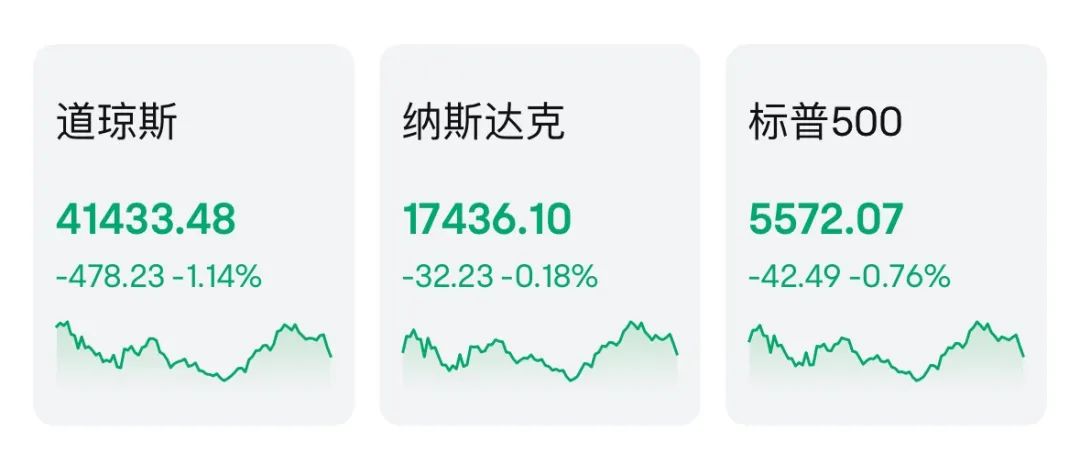 截至收盘,道琼斯指数跌1.14%,报41433.48点;标普500指数跌0.76%,报5572.07点;纳斯达克指数跌0.18%,报17436.10点。