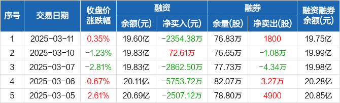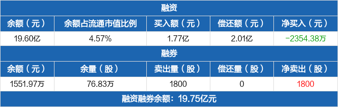 融资方面,当日融资买入1.77亿元,融资偿还2.01亿元,融资净偿还2354.38万元。融券方面,融券卖出1800股,融券偿还0股,融券余量76.83万股,融券余额1551.97万元。融资融券余额合计19.75亿元。