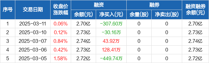 融资方面,当日融资买入1893.26万元,融资偿还2200.86万元,融资净偿还307.6万元。融券方面,融券卖出0股,融券偿还0股,融券余量0股,融券余额0元。融资融券余额合计2.7亿元。