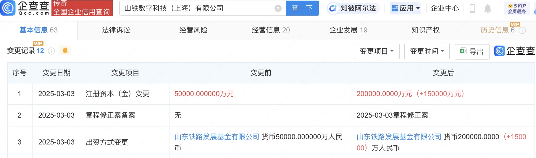 上证报中国证券网讯企查查APP显示,近日,山铁数字科技(上海)有限公司发生工商变更,注册资本由5亿元人民币增至20亿元人民币。