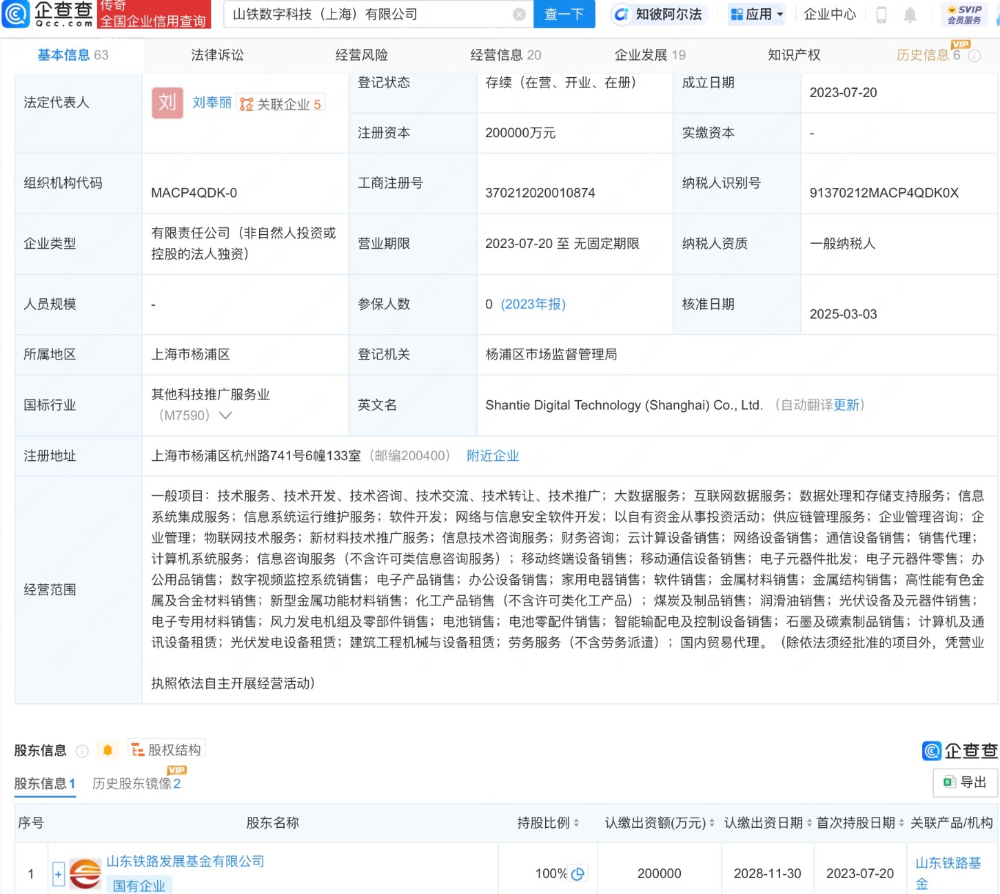 企查查信息显示,该公司成立于2023年,法定代表人为刘奉丽,经营范围含大数据服务、互联网数据服务、数据处理和存储支持服务等,由山东铁路发展基金有限公司全资持股。