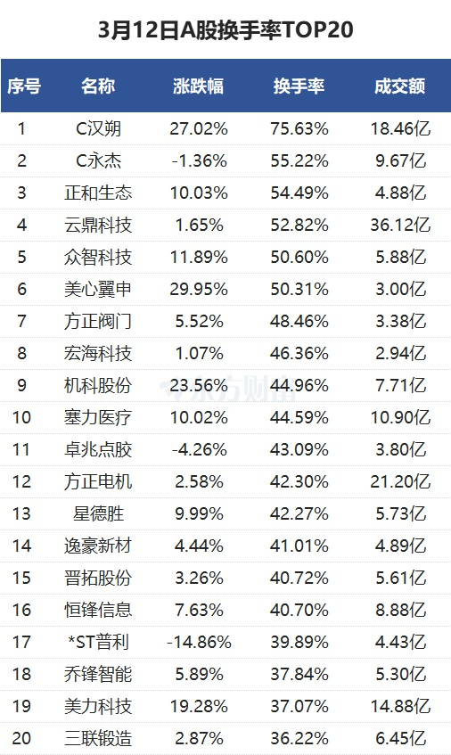 当天换手率最高的个股为C汉朔,全天换手率75.63%。C永杰紧随其后,全天换手率55.22%。