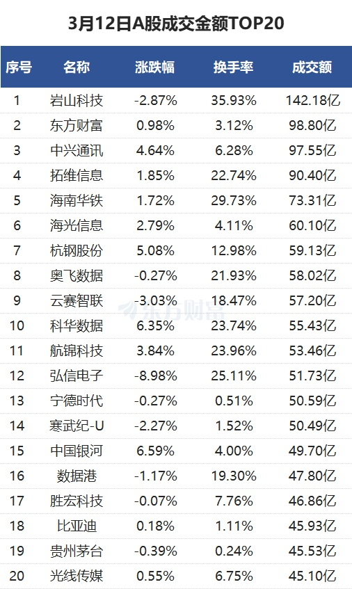 沪深两市成交额1.68万亿元,较上一交易日放量2019亿元。个股方面,岩山科技当日成交142.18亿元。中兴通讯当日成交97.55亿元。