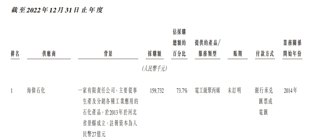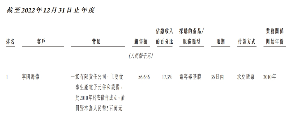 首先,海伟电子2022年第一大客户(宁国海伟)与第一大供应商(海伟石化)均为公司实控人亲属宋俊青控制的企业。采购端,海伟电子当年向关联方海伟石化集中采购1.60亿元电工级聚丙烯,占总采购额的73.7%;销售端,其向另一关联方宁国海伟销售电容器基膜5663.6万元,占当期收入的17.3%。