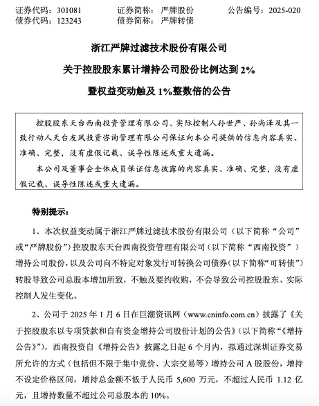 3月11日晚间,浙江严牌过滤技术股份有限公司(以下简称“严牌股份”或“公司”)发布关于控股股东累计增持公司股份比例达到2%暨权益变动触及1%整数倍的公告。公告称,截至3月10日,公司控股股东西南投资已通过深圳证券交易所以集中竞价交易方式累计增持公司股份411.5460万股,占公司总股本的2.00%,累计增持金额为3875.53万元(不含手续费)。