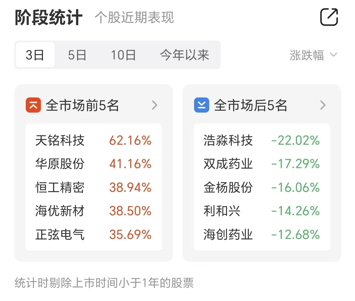 3月12日市场全天冲高回落,近三个交易日里,A股全市场涨幅前五名分别为天铭科技、华原股份、恒工精密、海优新材、正弦电气,其中天铭科技三日涨幅达62.16%,位列涨幅榜第一。