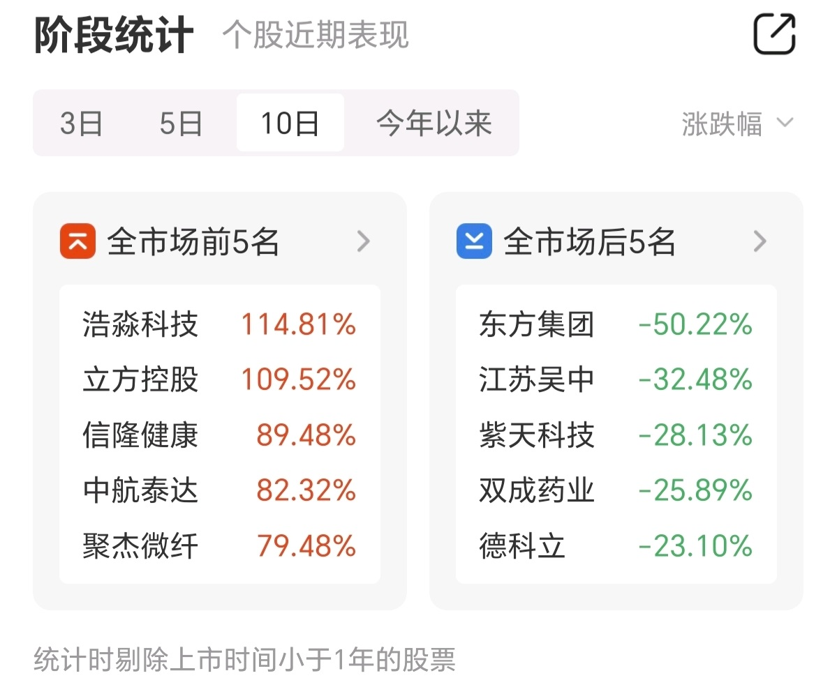 与此同时,近十个交易日涨幅前五名的个股分别为浩淼科技、立方控股、信隆健康、中航泰达、聚杰微纤。
