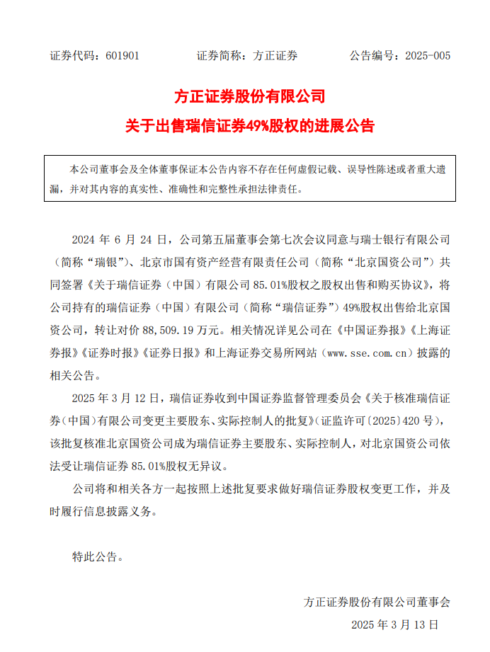 从时间线来看,此番交易可追溯一年前。2024 年 6 月,瑞银和方正证券与北京国资公司达成三方协议,瑞士银行与方正证券分别向北京国资公司出售所持有的瑞信证券36.01%及 49%股权。