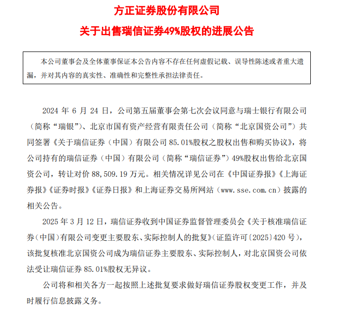 2024年6月,瑞银、方正证券以及北京国资公司达成三方协议,瑞银与方正证券分别向北京国资公司出售所持有的瑞信证券36.01%及49%股权。具体来看,该交易包括瑞银向北京国资公司出售所持有的瑞信证券36.01%股权,对价为9135万美元(约合人民币6.505亿元);方正证券向北京国资公司出售其所持有的瑞信证券49%股权,对价为1.24亿美元(约合人民币8.85亿元)。上述对价基于2024年6月24日1美元折合7.1201人民币的汇率进行计算。