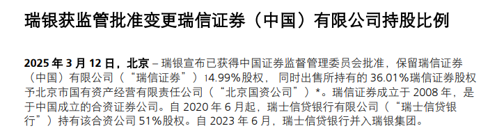 具体来看,瑞银方面宣布已获得中国证券监督管理委员会批准,保留瑞信证券14.99%股权,同时出售所持有的36.01%瑞信证券股权予北京市国有资产经营有限责任公司(下称北京国资公司)。